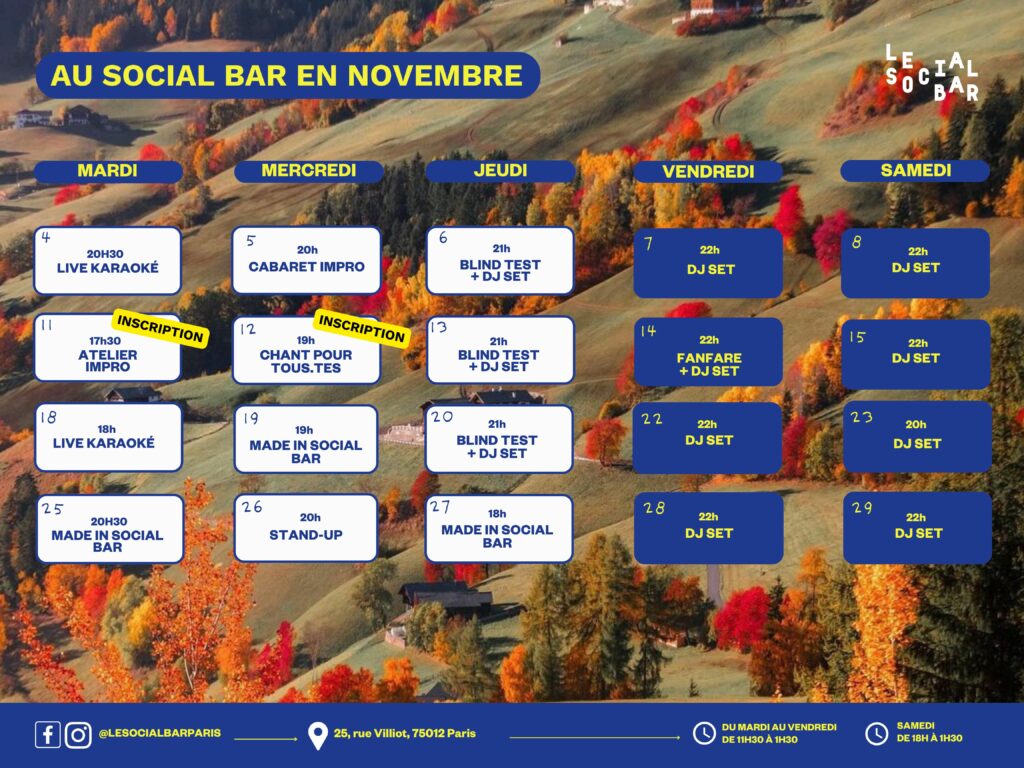 Le Social Bar Paris, c’est (quasiment) tous les soirs un événement drôle, convivial et festif ! Retrouve tous nos événements de la semaine à jour sur nos pages Facebook et Instagram.